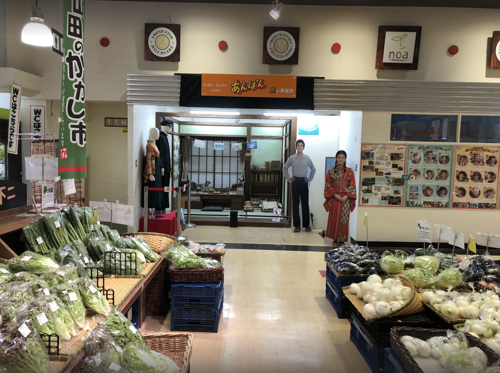 香美市土佐山田町のご当地スーパー、バリューノア店では、特設コーナーに『あんぱん』のセットが設営されました。