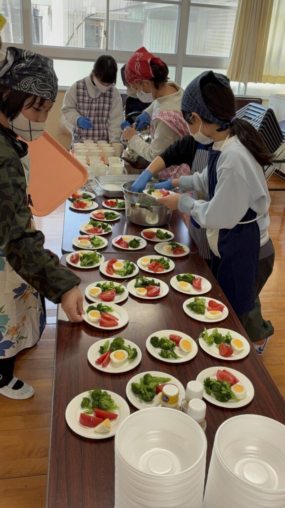 家庭科室では、大きな鍋を囲みながら真剣な表情で調理する姿が見られました。煮込んでいる間には、丁寧にアクを取り、味を確かめながら仕上げていきます。出来上がった料理は、家庭科室からランチルームへと協力して運び、配膳係やお迎え係など、それぞれが役割を持って地域の方々をお迎えしました。